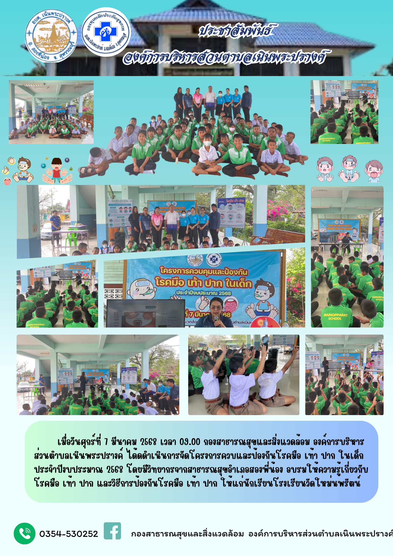 เมื่อวันศุกร์ที่ 7 มีนาคม 2568 เวลา 09.00 กองสาธารณสุขและสิ่งแวดล้อม องค์การบริหารส่วนตำบลเนินพระปรางค์ ได้ดดำเนินการจัดโครงการควบและป้องกันโรคมือ เท้า ปาก ในเด็ก ประจำปีงบประมาณ 2568 โดยมีวิทยากรจากสาธารณสุขอำเภอสองพี่น้อง อบรมให้ความรู้เกี่ยวกับโรคมือ เท้า ปาก และวิธีการป้องกันโรคมือ เท้า ปาก ให้แก่นักเรียนโรงเรียนวัดใหม่นพรัตน์