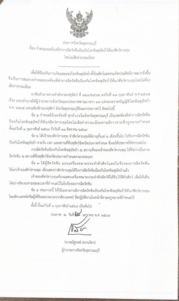 ประกาศจังหวัดสุพรรณบุรี เรื่อง กำหนดเขตท้องที่ทำการฉีดวัคซีนป้องกันโรคพิษสุนัขบ้าให้แก่สัตว์ควบคุม โดยไม่เสียค่าธรรมเนียม