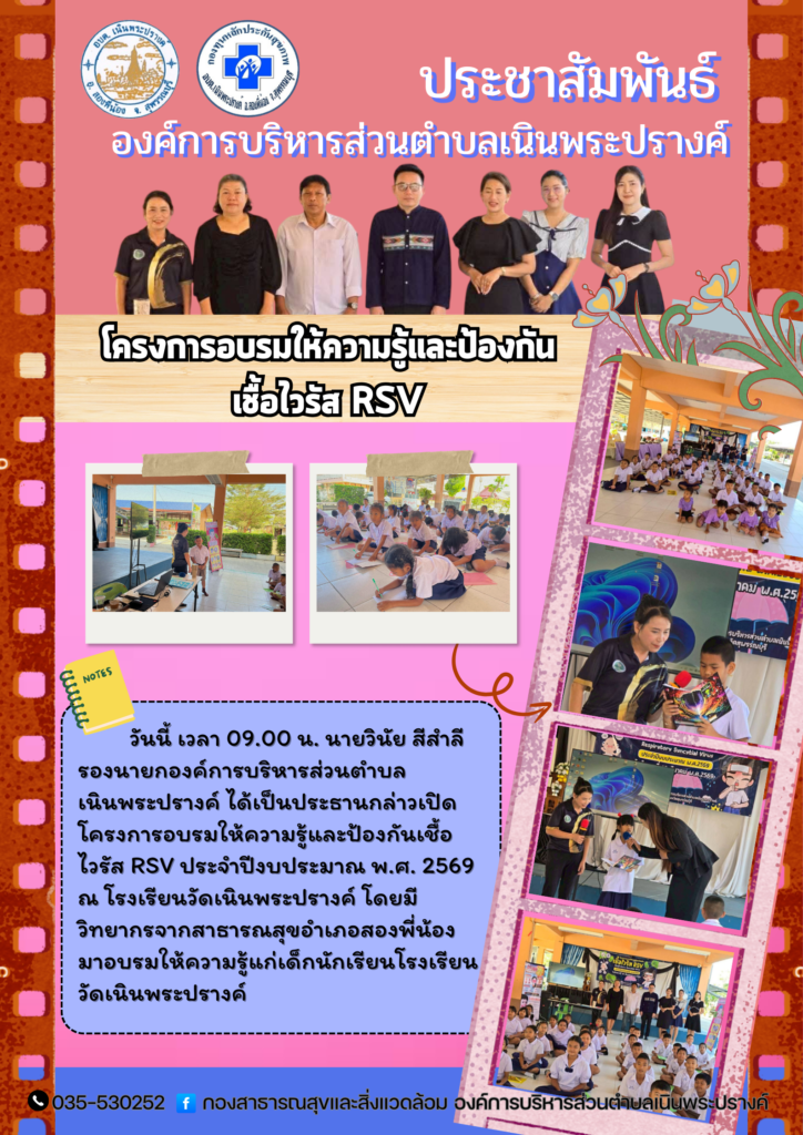 วันนี้ เวลา 09.00 น. นายวินัย สีสำลี รองนายกองค์การบริหารส่วนตำบลเนินพระปรางค์ ได้เป็นประธานกล่าวเปิดโครงการอบรมให้ความรู้และป้องกันเชื้อไวรัส RSV ประจำปีงบประมาณ พ.ศ. 2569 ณ โรงเรียนวัดเนินพระปรางค์ โดยมีวิทยากรจากสาธารณสุขอำเภอสองพี่น้อง มาอบรมให้ความรู้แก่เด็กนักเรียนโรงเรียนวัดเนินพระปรางค์